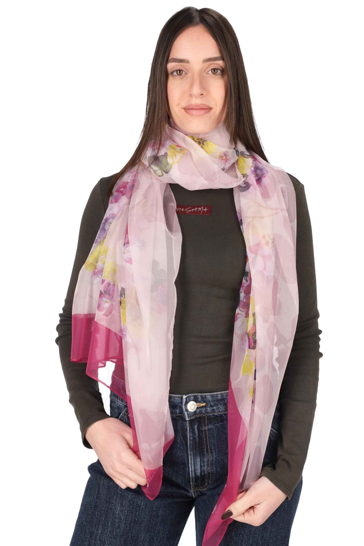 La stola è realizzata in poliestere semitrasparente, con stampa floreale e logo stampato, con bordi rifiniti.