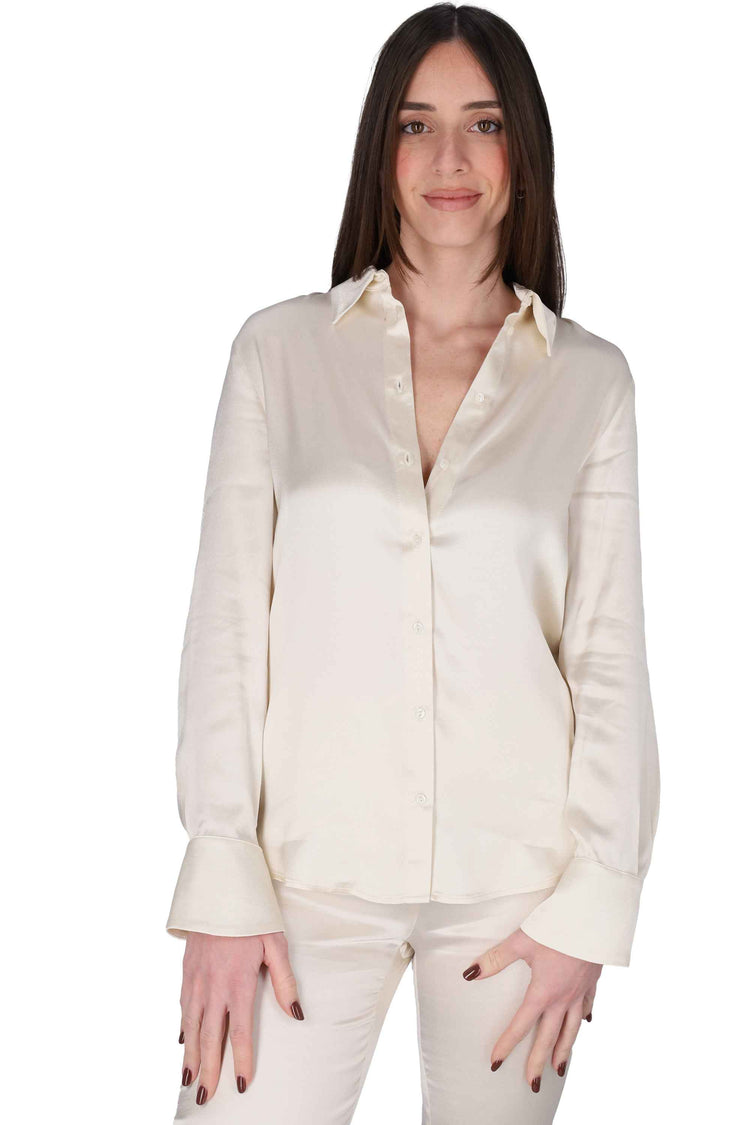 La camicia è realizzata in tessuto rayon e viscosa, effetto lucido.